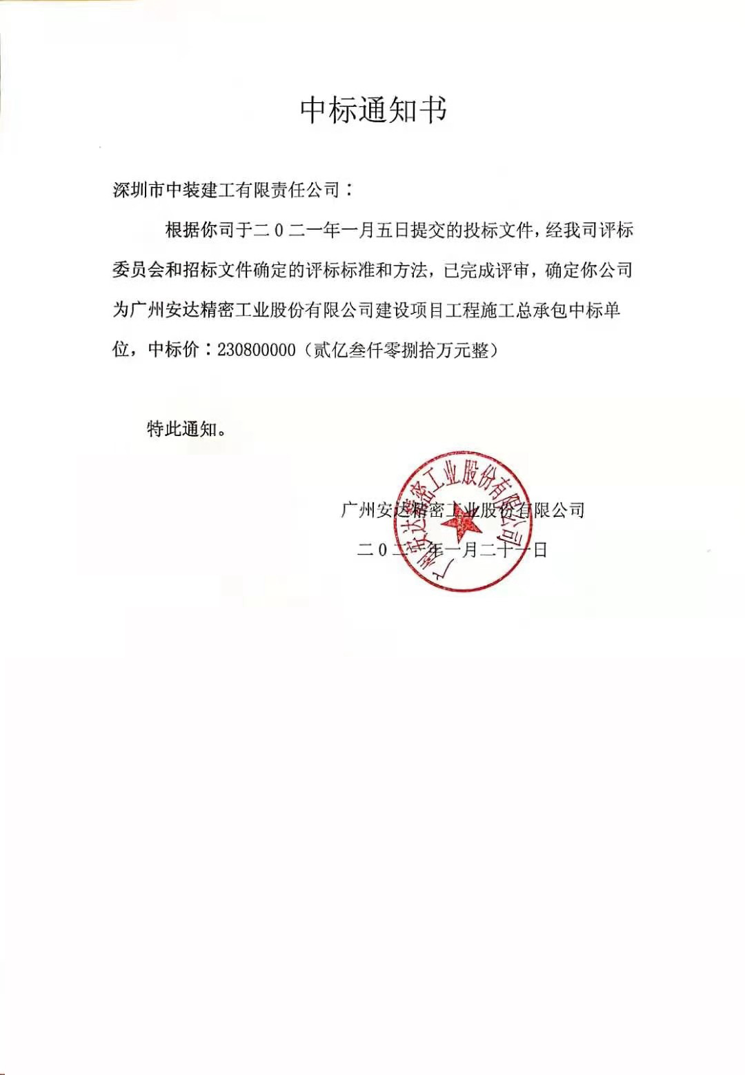 近日,中裝建工中標(biāo)廣州安達(dá)精密工業(yè)股份有限公司建設(shè)項(xiàng)目工程施工承包(以下簡(jiǎn)稱“廣州安達(dá)股份施工總承包項(xiàng)目”),中標(biāo)金額為2.3億元。