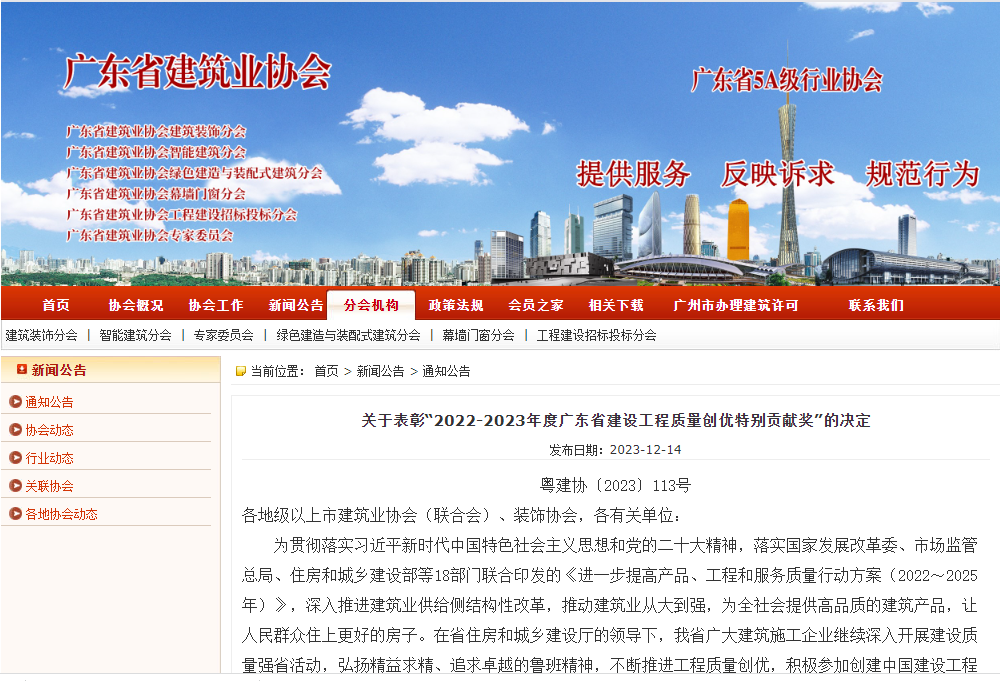 近日,廣東省建筑業(yè)協(xié)會(huì)發(fā)布了《關(guān)于表彰“2022-2023年度廣東省建設(shè)工程質(zhì)量創(chuàng)優(yōu)特別貢獻(xiàn)獎(jiǎng)”的決定》。因創(chuàng)優(yōu)工作成績(jī)顯著,中裝建設(shè)被授予“2022-2023年度廣東省建設(shè)工程質(zhì)量創(chuàng)優(yōu)特別貢獻(xiàn)獎(jiǎng)”榮譽(yù)稱(chēng)號(hào)。