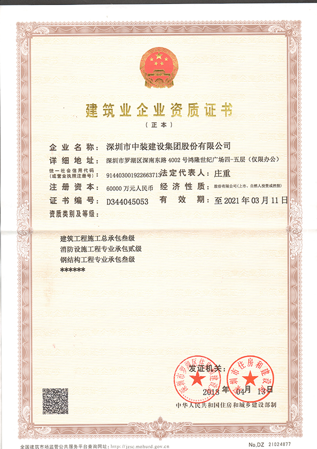 至此,中裝建設(shè)已經(jīng)具有建筑裝飾專(zhuān)項(xiàng)工程設(shè)計(jì)甲級(jí)、建筑裝修裝飾工程專(zhuān)業(yè)承包壹級(jí)、建筑幕墻工程專(zhuān)業(yè)承包壹級(jí)、電子與智能化工程專(zhuān)業(yè)承包壹級(jí)、建筑機(jī)電安裝工程專(zhuān)業(yè)承包壹級(jí)、防水防腐保溫工程專(zhuān)業(yè)承包壹級(jí)、展覽陳列工程設(shè)計(jì)與施工一體化壹級(jí)資質(zhì)、建筑工程施工總承包叁級(jí)資質(zhì)等行業(yè)從業(yè)資質(zhì)。