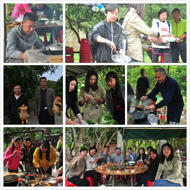 上午十點,隊伍抵達目的地,接受第一項任務考驗——“自助野炊”,以小組為單位,相互合作,就地取材,共同制作美味佳肴。每個組分工不同,有的殺雞、宰魚、摘菜,有的燒柴生火,有的炒菜做飯。每個組菜色也不同,有的北方做法偏辣,有的南方做法偏淡。個個忙的不亦樂乎,經(jīng)過了大家的辛勤努力,終于品嘗到了各色美食,有的人這桌吃吃,那桌嘗嘗,歡聲笑語不斷。