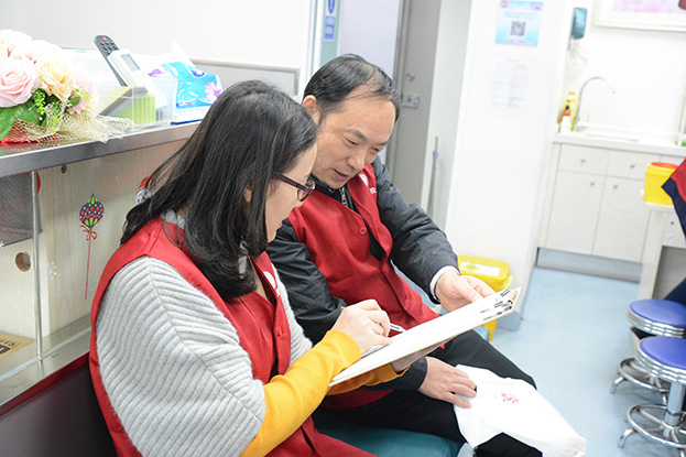 下午16時許,參加義務(wù)獻血的員工志愿者來到獻血地點,在工作人員的引導(dǎo)下,登記信息、測量血壓、抽血化驗,血液檢驗合格后開始無償獻血。