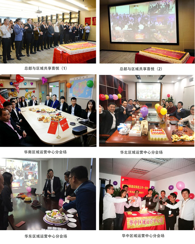 遠程共享,歡喜同賀。中裝建設(shè)華南區(qū)域運營中心、華北區(qū)域運營中心、華中區(qū)域運營中心、華東區(qū)域運營中心、青島分公司等分會場與集團總部遠程視頻、共同慶祝中裝建設(shè)上市一周年。